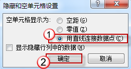 在打开的设置对话框中为空单元格的显示进行设置。默认情况下选择的是“空距”,我们可以将其改为“用直线连接数据点”。