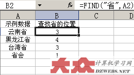 我们在B2单元格中,使用函数公式:=FIND("省",A2)即可得出“云南省”这串字符中“省”所出现的位置为3。