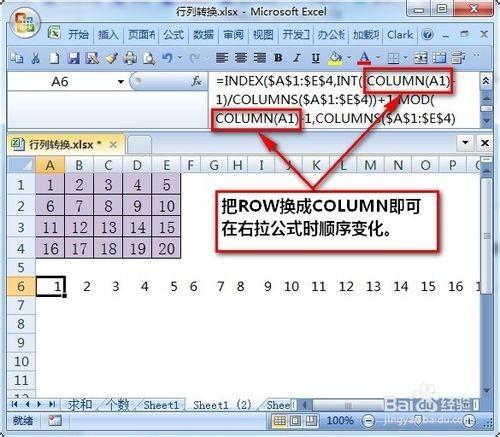 如下图,在G1输入公式=INDEX($A$1:$E$4,INT((ROW(A1)-1)/5)+1,MOD(ROW(A1)-1,5)+1)并下拉。
