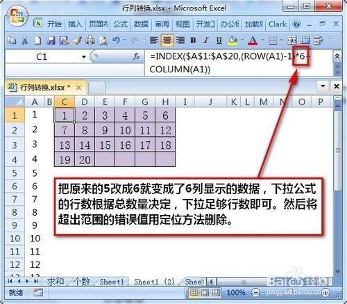 此法是第三、四种方法的逆方法,如下图,要将单列数据变成4行5列的表格,在C1输入公式:=INDEX($A$1:$A$20,(ROW(A1)-1)*5+COLUMN(A1)),右拉5列,下拉4行公式即可完成行列的转换。