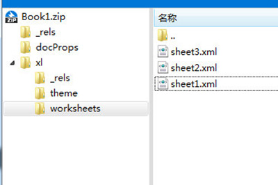 文件变成压缩包之后我们打开它,并将其解压,在里面这个xl/worksheets这个目录中找到工作簿。