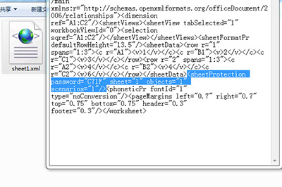 2、哪个有加密的工作簿就打开哪个,用记事本的形式来打开。然后找到有sheetProtection password这行代码,并将其括号中的内容删除掉并保存。