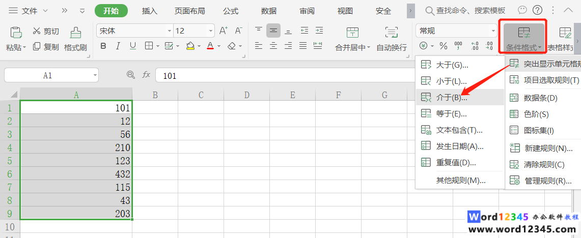 2、然后,选中数据,点击条件格式-突出显示单元格规则-介于