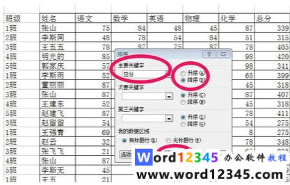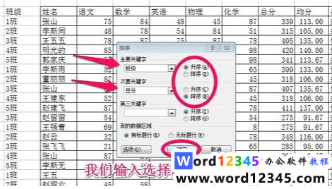 4、有时排序要求高,比如:首先按照”班级“名称升序排列,然后一个班级的同学再按照”总分“降序排列,这时候需要对两个关键字进行排序,主要关键字为”班级“,次要关键字为”总分“,那在排序的时候需要如图进行选择即可。