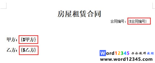 1、制作合同模板文件,把合同变量部分用特殊变量替换。图示如下: