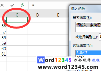 6、即可弹出插入函数对话框,同时在单元格中会先出现一个“=”符号。