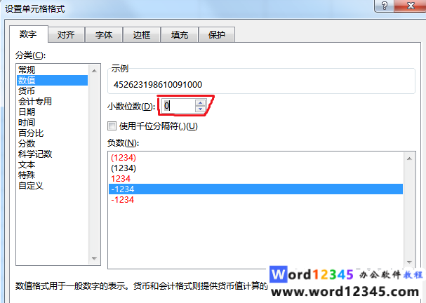 2、如果输入的数值有小数点,我们在小数位数选择要显示的小数位,我们输入数值为身份证号,不需要显示小数点,这里我们设置为0。设置OK后,点击确定按钮。