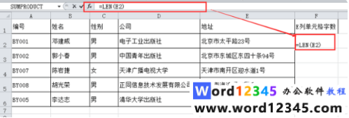 4、在需单元格F2公式栏中输入公式“=LEN(E2)"