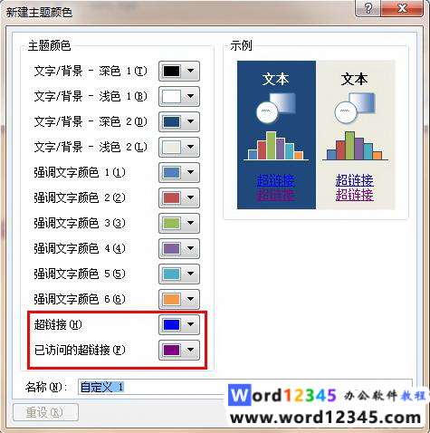 2、在新建主题颜色弹出框中的“超链接”及“已访问的超链接”后面可以调整颜色-保存即可。