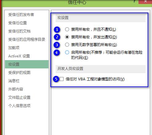 宏安全设置步骤3:打开的“宏设置”界面有5个选项如图所示。