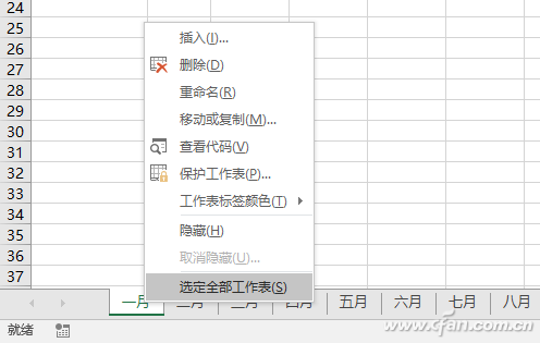 接下来的问题是,所有创建的工作表中,都会有一个透视表,而现在我们已经不需要它了。在任意一个工作表标签上右击,从右键菜单中选择“选定全部工作表”。