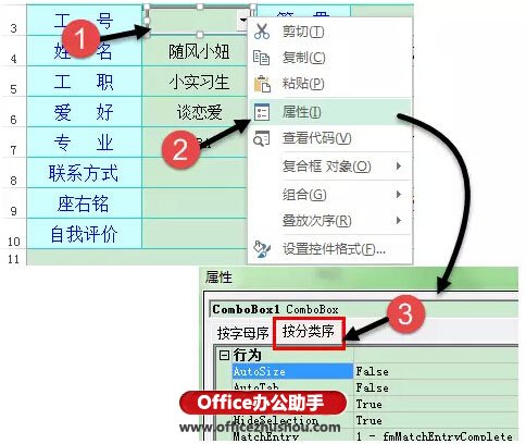 2、按住鼠标左键,拖动鼠标,在B3单元格任意画一个形状,尔后右键单击该控件,在弹出的选择菜单中,单击【属性】,再单击【属性】菜单中的【按分类序】