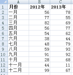 1、比对两列数的大小,比如比对2013年和2012年的数,如果2013年月份的数字比2012年的大,则底色表示出来