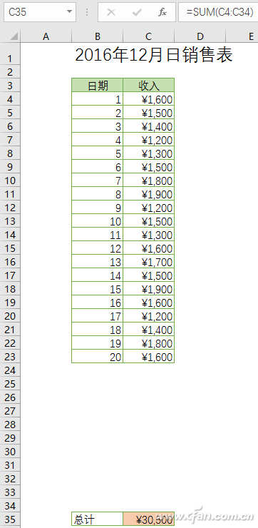 现在要制作的是一个日报表的Excel表格,月份按最大31天计算留出空档,从C4到C34单元格。第C35单元格为汇总数值,其中输入的计算公式为“=SUM(C4:C34)”。如此一来,每天的销售额只需要直接输入进去,汇总的数值就会实时改变。