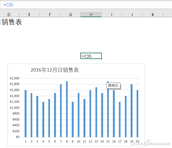 接下来移动图表,使得标题文字与上一步中设置的引用C35的单元格对齐,一个动态的图表标题就完成了。现在当我们输入新的日销售额的时候,图表标题中的汇总数字