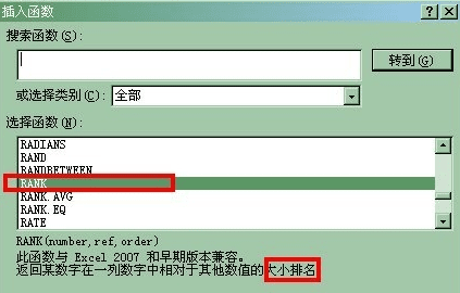 我们选择RANK排名函数,我们看到有3个参数,number,ref,order即数值、引用、排序;