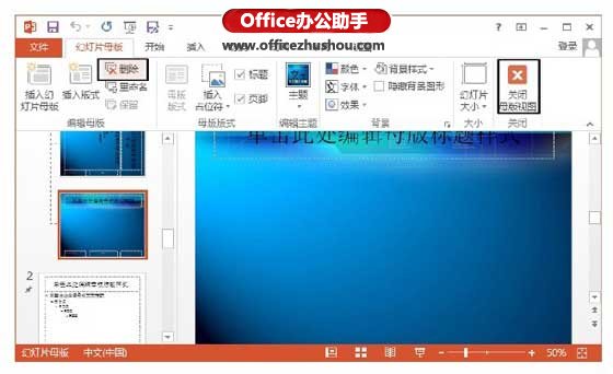 3、选择幻灯片母版后单击“编辑母版”组中的“删除”按钮,能够将选择的母版删除,如图3所示。完成母版的设置和创建后,在“幻灯片母版”选项卡的“关闭”组中单击“关闭母版视图”按钮将退出幻灯片母版视图模式,回到普通视图模式。