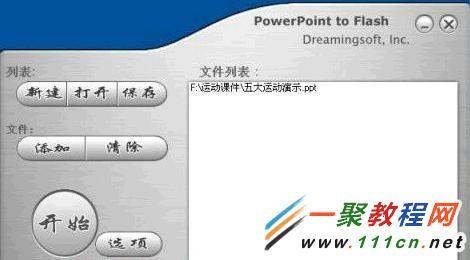 依次点击“开始程序PowerPointtoFlash”,进入PowerPointtoFlash运行主界面。在PowerPointtoFlash的主界面上点击文件列标签下的“添加”按钮,在出现的浏览框里选择实现准备好的需要制作的幻灯片文件 (PPT或者PPS文件)。单击“打开”命令按钮后,在软件的“文件列表”下的列表框中会出现相应的文档。如果发现需要修改,还可以先选中,然后单击“清除”按钮进行删除(图1)。图1软件界面