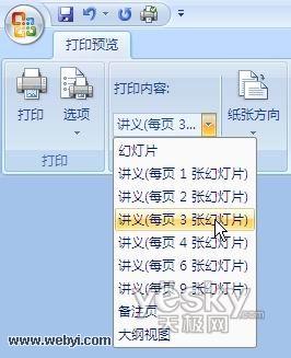 3.在“页面设置”组中,单击“打印内容”下的箭头,然后从列表中选择你需要的讲义版式选项。在此,请选择“讲义(每页3张幻灯片)”格式(如图2)。因为,只有该格式的讲义才为观众提供备注行,而其他格式不提供备注行。