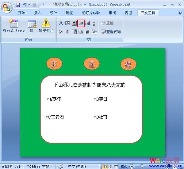 1、设计出你要的背景颜色、框架、标题和题目,如图所示,然后点击开发工具控件里面的打钩小方框,在幻灯片上面添加。