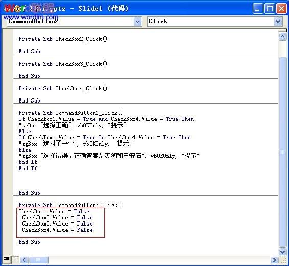 MsgBox "选择错误,正确答案是苏洵和王安石", vbOKOnly, "提示"