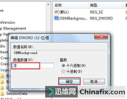 3、在右侧找到“OEMBackground”,双击该值,将“数值数据”的值改为“1”,单击“确定”。