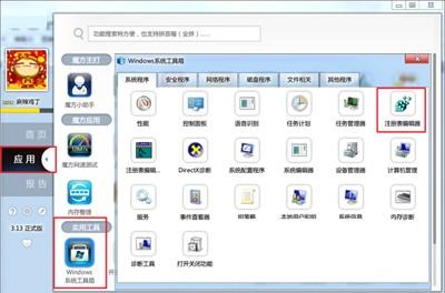 打开注册表,可以选择在“开始菜单”中搜索“regedit”,回车运行,或者Win+R,打开“运行”窗口,键入“regedit”,回车运行,或者打开魔方优化大师,在“应用”中找到“Windows系统工具箱”,打开“注册表编辑器”也可。