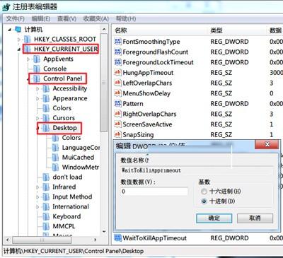 然后依次展开到“HKEY_CURRENT_USERControl PanelDesktop”,然后在右侧窗口空白处右键单击,选择“新建”,“DWORD 32位值”(PS:注意键值类型),并将其重命名为“WaitToKillAppTimeout”(PS:某些卫士软件有此功能,可能有些网友已经有此键值,那么无需新建,只需进行后续操作),同时把该键值的数值修改为0,点击“确定”之后就可以关闭注册表编辑器了。