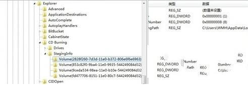 2、在注册表编辑器的左侧展开定位到“HKEY_CURRENT_USERSoftwareMicrosoftWindowsCurrentVersionExplorerCD BurningStagingInfoVolume{最后一组数字是806e6f6e6963};