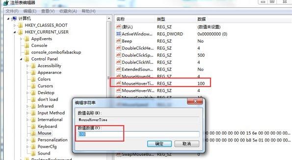 2.在打开的注册表编辑器窗口中,咱们依次点击展开左侧菜单中的HKEY_CURRENT_USER/Control Panel/Mouse,之后,咱们在Mouse项的右侧窗格中找到MouseHoverTime选项,并双击打开进入数值修改窗口,将默认400修改为100,这边的单位为毫秒,再点击确定按钮,然后退出注册表编辑器就可以了。