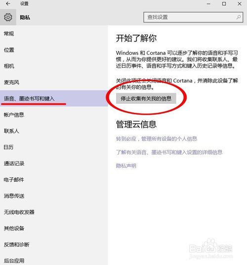 选择“语音、书写和键入”,点击“停止收集有关我的信息”。