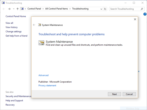 Windows troubleshooter疑难解决是Windows 10中的一个非常有用但鲜为人知的工具,可以找出性能问题解决它们。要启动它,在搜索框内输入troubleshooting,然后点击弹出的“Troubleshooting Control Panel”图标,随后在疑难解决控制面板中的系统与安全部分中选择“Run maintenance tasks(运行维护程序)”,这样就会弹出一个“Troubleshoot and help prevent computer problems”窗口,继续点击下一步。
