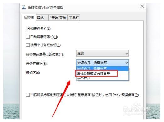 下拉之后我们可以看到有三个选择,这个时候我们选择第二个选项:当任务栏被占满时合并。