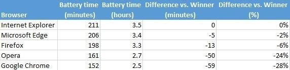 外媒Digital Citizen最近做了一项有趣的续航测试,在三款Win10系统设备上分别对IE11,Edge 20,Firefox 41,Chrome 46,Opera 32共五款浏览器进行续航测试。额,电脑续航测试为啥要测试浏览器呢?