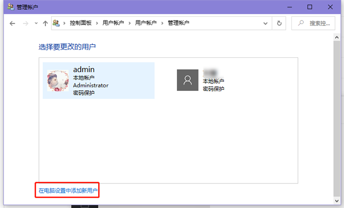 依次进入“控制面板”-“用户管理”-“管理其它用户"界面。