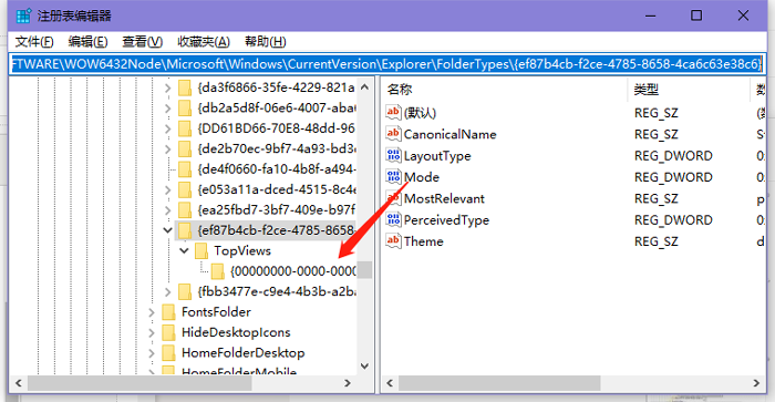 3、在注册表中找到,HKEY_LOCAL_MACHINE->SOFTWARE->Microsoft->Windows->CurrentVersion->Explorer->FolderTypes->{ef87b4cb-f2ce-4785-8658-4ca6c63e38c6}->TopViews->{00000000-0000-0000-0000-000000000000}。