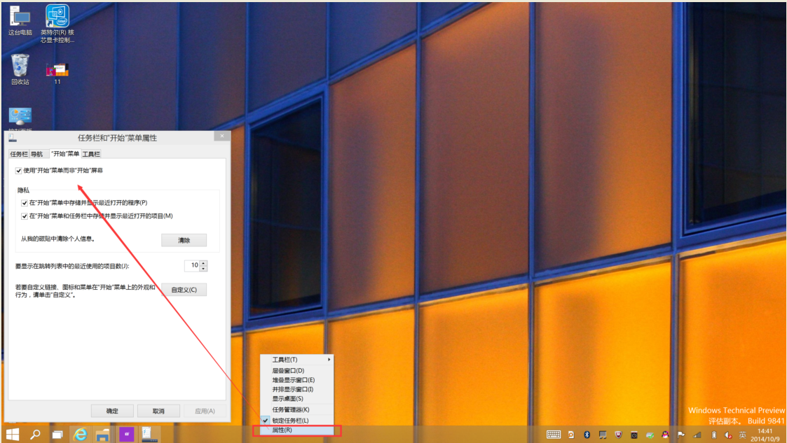 微软在Windows 10技术预览版中直接开启了新的开始菜单,如果你想恢复为开始屏幕:任务栏属性>开始菜单>取消勾选“使用开始菜单而非开始屏幕”>注销并更改设置即可。
