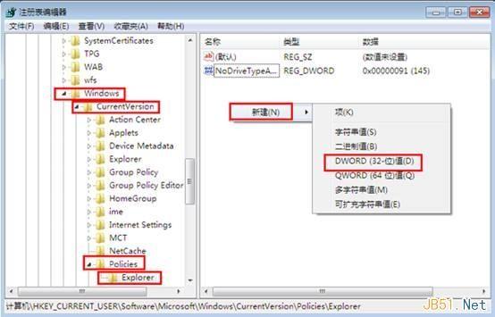 2.打开注册表编辑器,左边栏目中依次进入“HKEY_CURRENT_USE ” — “software” — “Microsoft” — “Windows” — “CurrentVersion” — “Po-licies” — “Explorer”,在右边栏目中右击,选择“新建” — “DWORD值”,如下图所示
