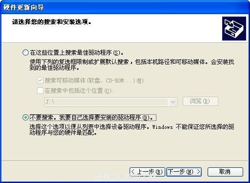 4. 选择“不要搜索,我要自己选择要安装的驱动程序”,然后“下一步”;