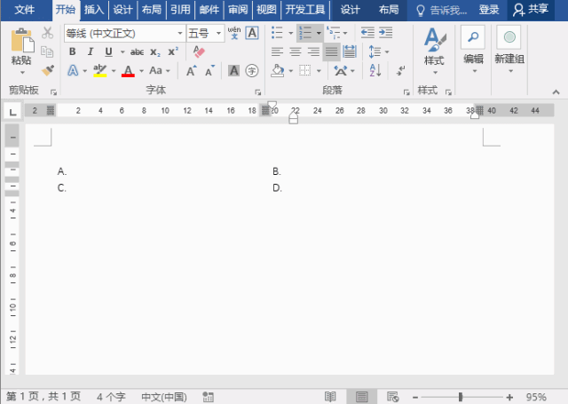 (2)在选项A-B,C-D中间位置按【Tab】键添加一个制表符,此时将把光标后边的文字移到与标尺制表位对齐。