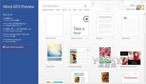 打开Word2013预览版,在初始界面中我们可以看到左边列出了最近打开过的文档,右边是丰富的模板。我们可以点击“Open Other Documents”,从文件夹中挑选自己想要浏览的pdf文件。