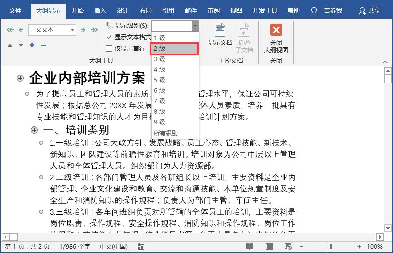 步骤三:选择”大纲显示“选项卡,在”显示级别“中设置标题级别,标题样式1就设置1级,标题样式为2,就设置显示2级......