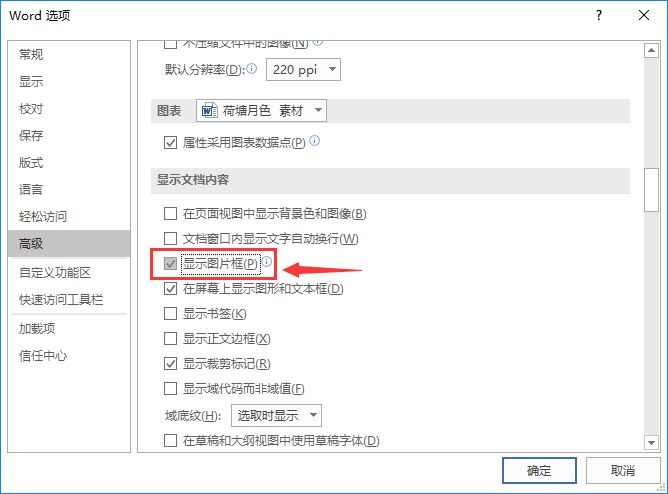 点击【文件】-【选项】命令,打开“Word选项”对话框,选择“高级”选项卡,在”显示文档内容“栏中勾选”显示图片框“复选框,单击”确定“按钮。