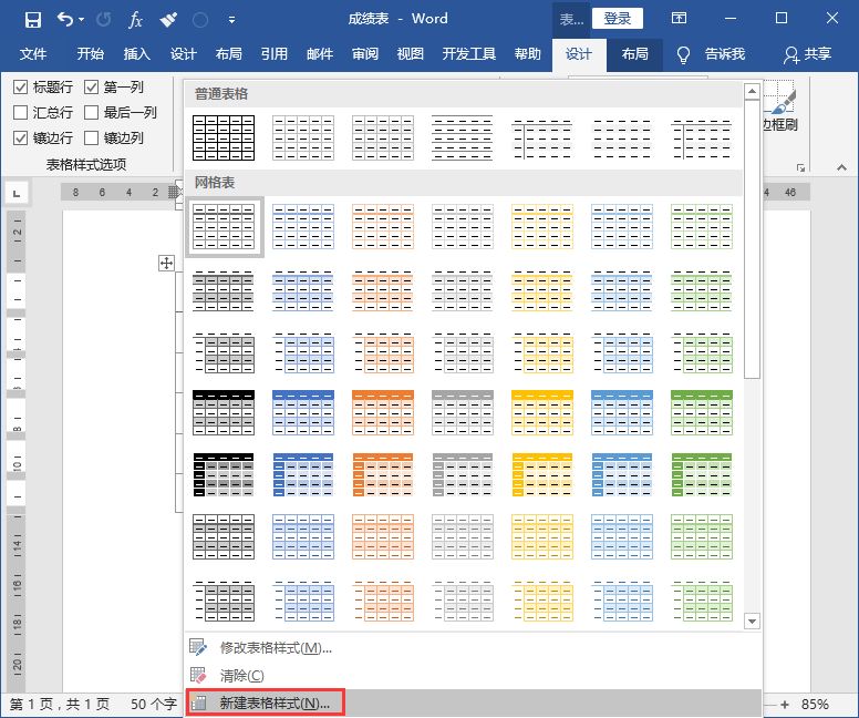 第一步:选择文档中的表格,点击【表格工具】-【设计】选项卡,单击“表格样式”库右侧的下拉按钮,在弹出的菜单中选择“新建表格样式”命令。