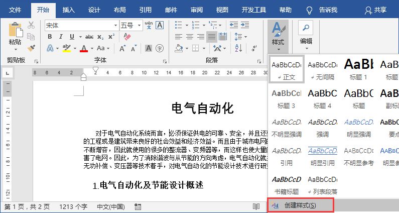 第一步:点击【开始】-【样式】按钮,在弹出的列表框中选择“创建样式”命令。