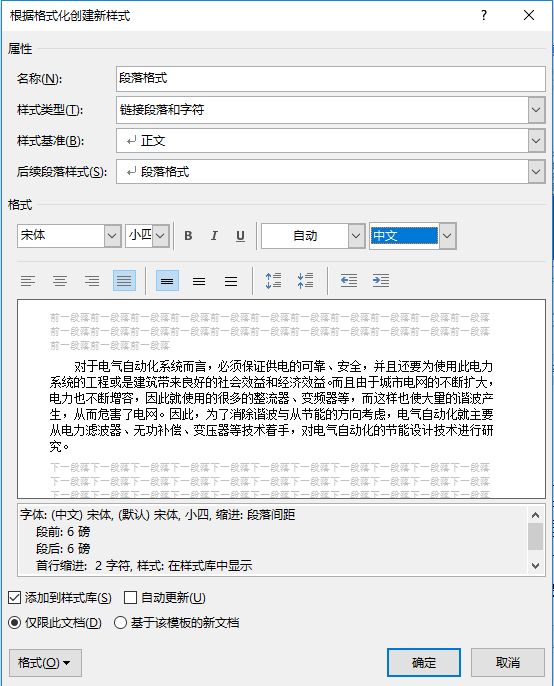 第三步:在打开的对话框中设置文本格式和段落格式,如,字体、字号、颜色、对齐方式、段落间距等,然后单击“确定”按钮。