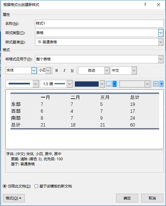 第二步:打开“根据格式化创建新样式”对话框,此时你会发现,“样式类型”栏已默认为“表格”。在“格式”栏中设置表格格式,如,字体、字号、边框、线条样式及颜色等,然后单击“确定”按钮。