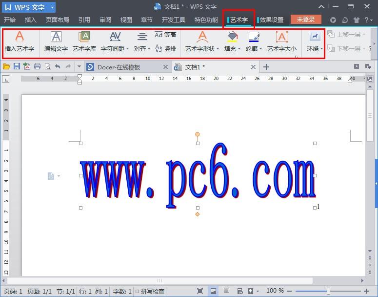 5、选择艺术字我们可以看到在菜单栏中多出了一个艺术字的选型卡,大家可以再这里设置艺术字的各种格式。