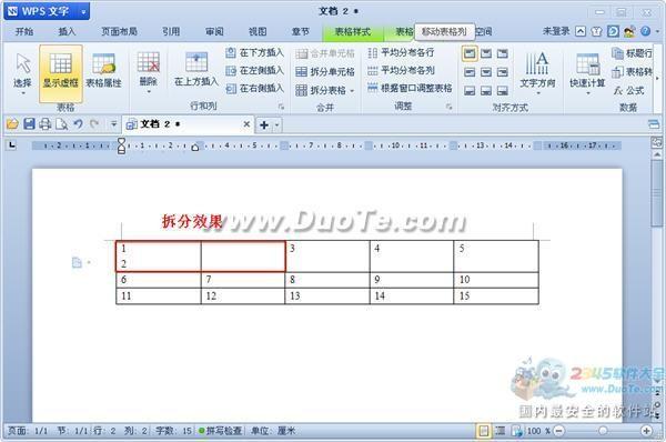 WPS文字中表格的合并和拆分也是相对比较基础的技巧,下面就一个3行5列的表格,通过单元格1和单元格2进行合并和拆分。
