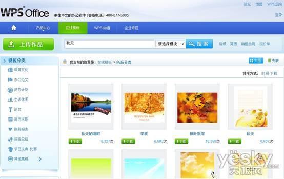 最近WPS为大家奉上的精选秋季模版,引领各位网友体会最美、最具韵味的秋天的魅力。用户登录WPS Office官网在线模版频道http://www.wps.cn/moban/,在搜索框输入“秋天”就可以下载到几十种漂亮模板。